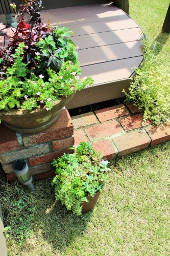 手つかずの新築のお庭を芝生とデッキにしたい、植物を植えてホッとできて四季を感じられるお庭にしたい、とのご相談でした。テラス屋根は住宅の外観に合う落ち着いた色合いにし、デッキは動線を考えて台形やR形など、デザインの異なる形を組み合わせました。植栽も既存の植物を活かしながら、無理なく楽しくお世話してもらえるジューンベリーの木やラベンダーなどの宿根草を植えています。お庭のポイントとして設えたレンガの花台も活用して下さっています。