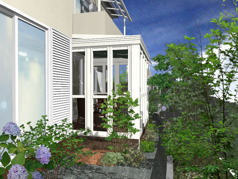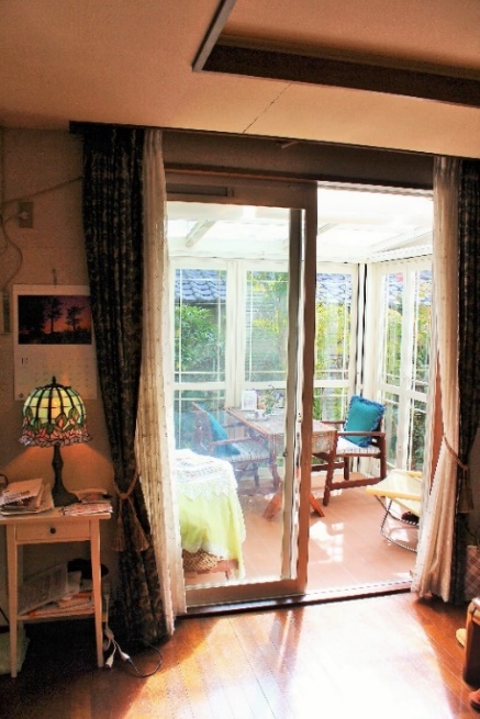「木漏れ日のなかでお茶を飲んだり、本を読んだりする時間が何よりもしあわせです。孫たちもここが気に入っていて、よい遊び場になっています。冬は日差しが入って温かく、リビングにまで伝わり暖房がいらない位です。夏はすべて開放して網戸にすると、心地よい緑の風が通りぬけます。」